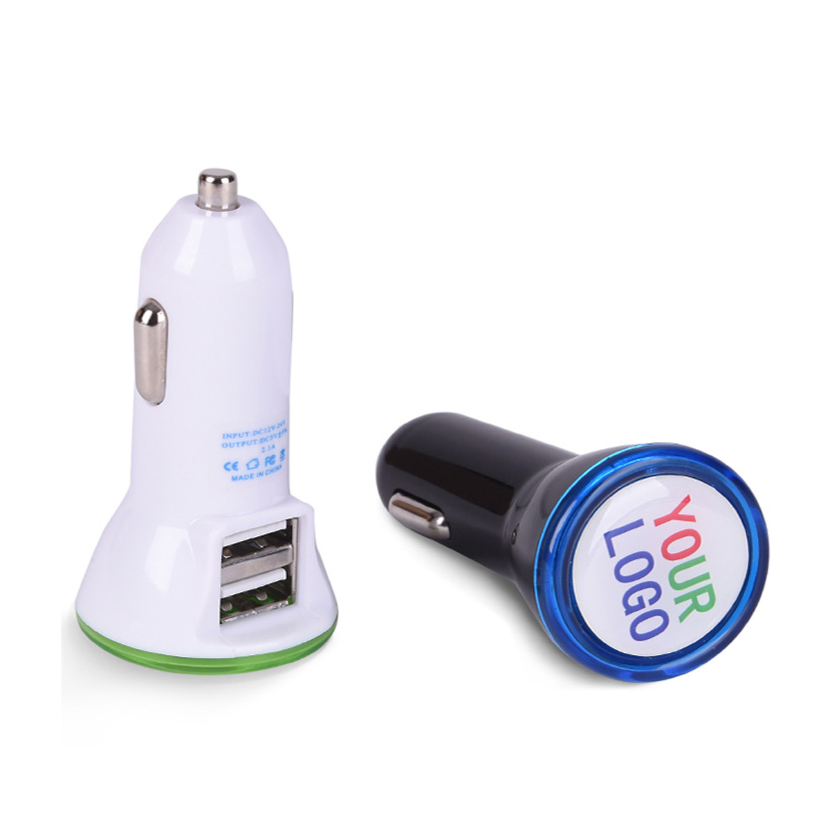 The circular soft light to create convenient for you to pull and plug USB cable in dim light, and allow you pull out this car adapter from car power outlet more easy. Intelligent circuit design protects against short circuiting, over-heating, over-current, and over-charging. Dual USB can charge up 2 mobile devices at the same time when you are on driving. Each USB port has 2.1A max output. Your logo can be epoxy imprinted on the upside of the charger with LED backlight.