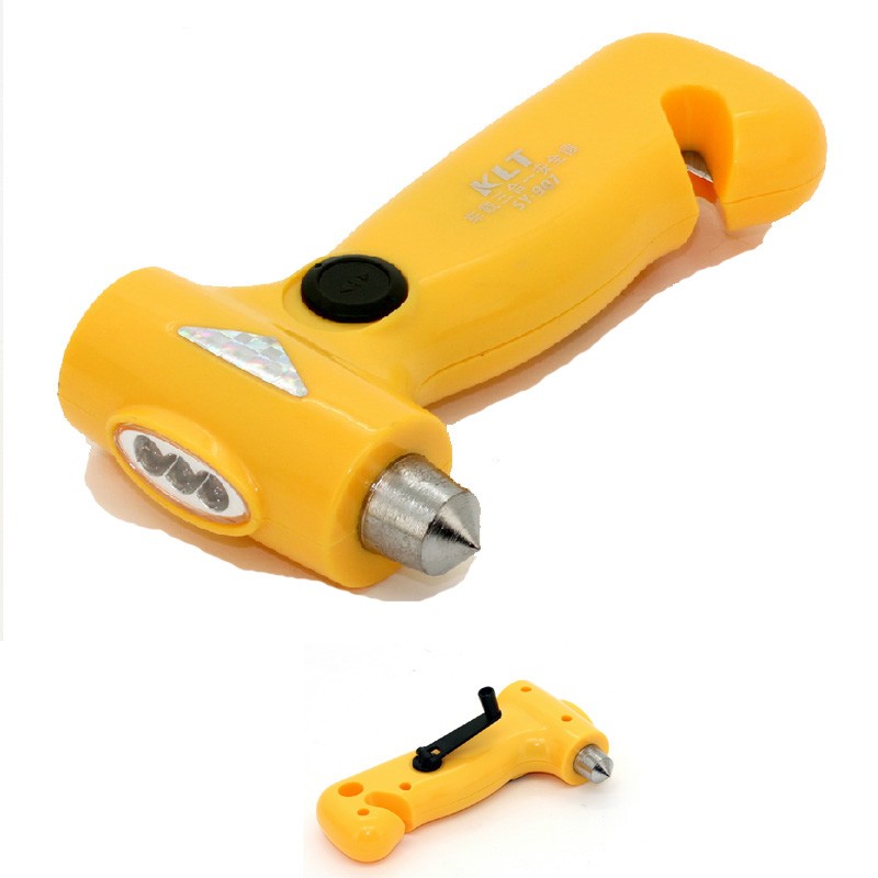 Three in one Auto Emergency Hammer. It's the indispensable item in your car. When emergency arise, this hammer with a fine point tip shatters auto safety glass, cut off selfbelt with another tip, crank handle to generate power and turn on the flashlight in the dark. Have this one, you won't be panic under unforeseen circumstance. Your LOGO can be imprinted on the handle.