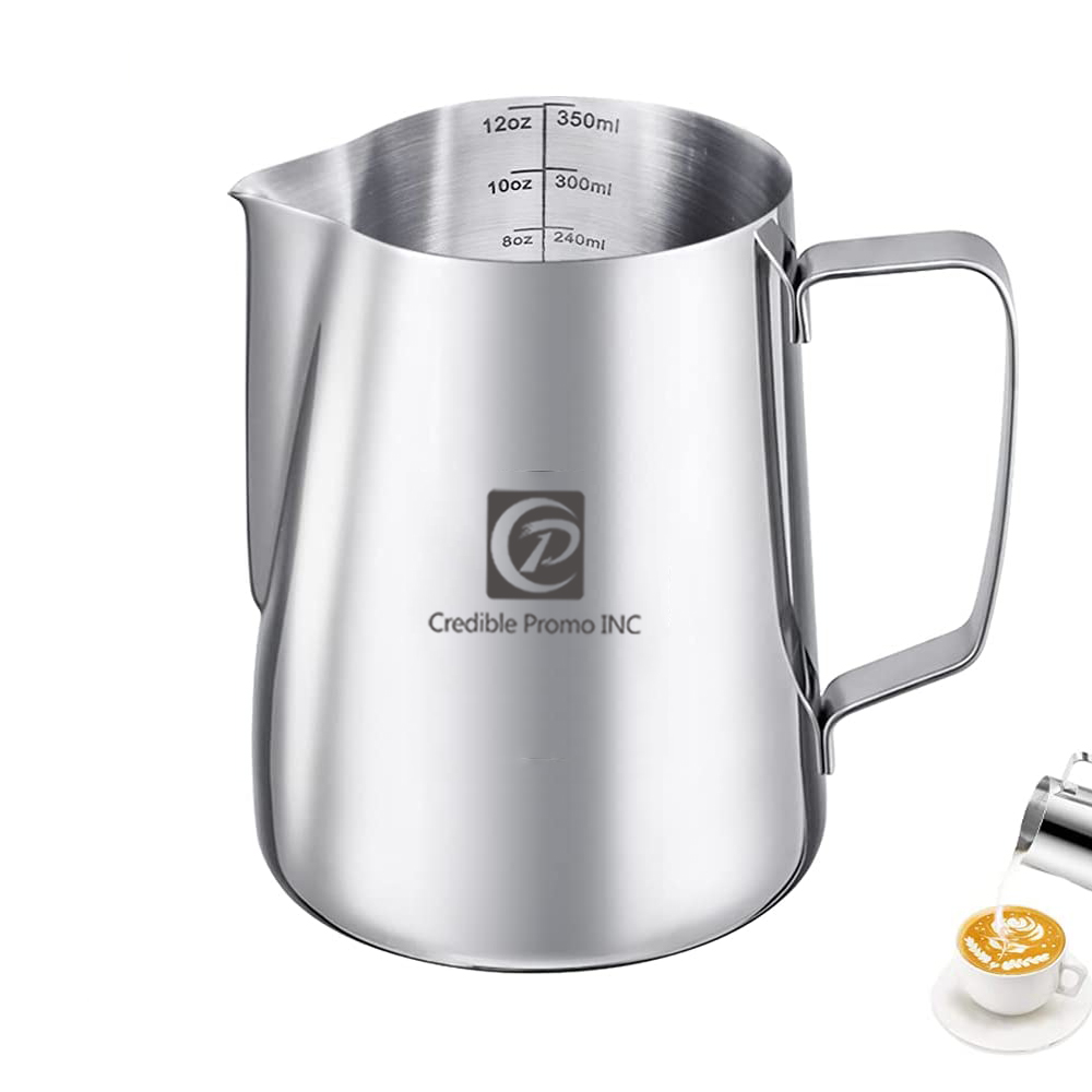 With the our milk frother pticher, you can become a barista in your home. And has clear internal graduated measurement lines, making it easier to control the amount of milk or cream per cup of coffee. Also you can use it to measure any liquid like serving milk, cream, water, juices. Lots of capacity is available, the price is based on 350ml(12oz) on website.