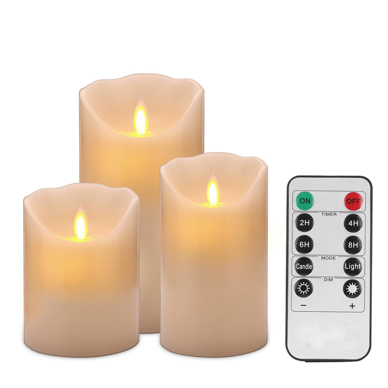3-PACK set includes a 4" pillar, a 5" pillar and a 6" pillar (each 3" diameter), 1 remote control. Genuine paraffin wax candles with realistic dancing LED flames let you add a festive or romantic glow to any room safely, even in the presence of small children and pets. Flickering flame technology creates the illusion of real flames. 10-Key remote control with 16.4-foot range lets you display candles in hard-to-reach places. Timer feature lets you schedule your candles in 2-, 4-, 6- and 8-hour increments, cycling every 24 hours. Smokeless and dripless candles with smooth, classic ivory color are ideal for bookshelves, bedrooms and as safe focal points in holiday wreaths and centerpieces.