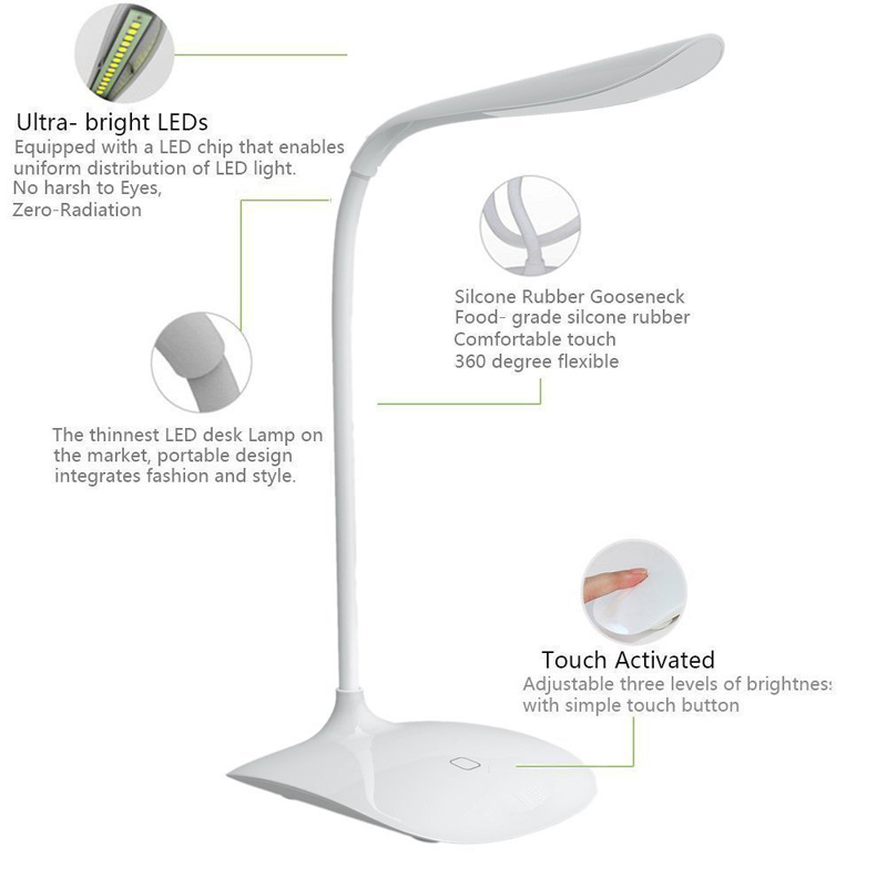 Stylish LED desk lamp with touch-sensitive control technology,there are 3-level brightness for choice. Free twist goose neck tube,360 degree rotation,bent it to any angle as you like. Built-in battery can be recharged with USB charge cable we provided,portable with light weight, convenient to use at home,office or outside. Let our LED Desk Lamp accompany you best in your daily life!