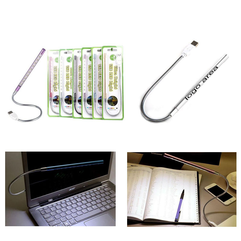 The flexible LED light plug in computer USB port can light your keyboard and protect your eyes, it also can work with your charge bank, make it be be a portable lantern. The flexible metal cord can make the light can be changed at any angle. And 10 LED can bring enough brightness, your LOGO can be imprint on it.