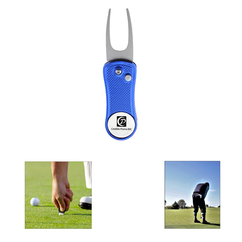 Lightweight easily fits in your pocket, just press the button and the switchblade action takes place. Ball marker comes with this tool, it is attached by a magnet in the tool. Full Color Logo are available.