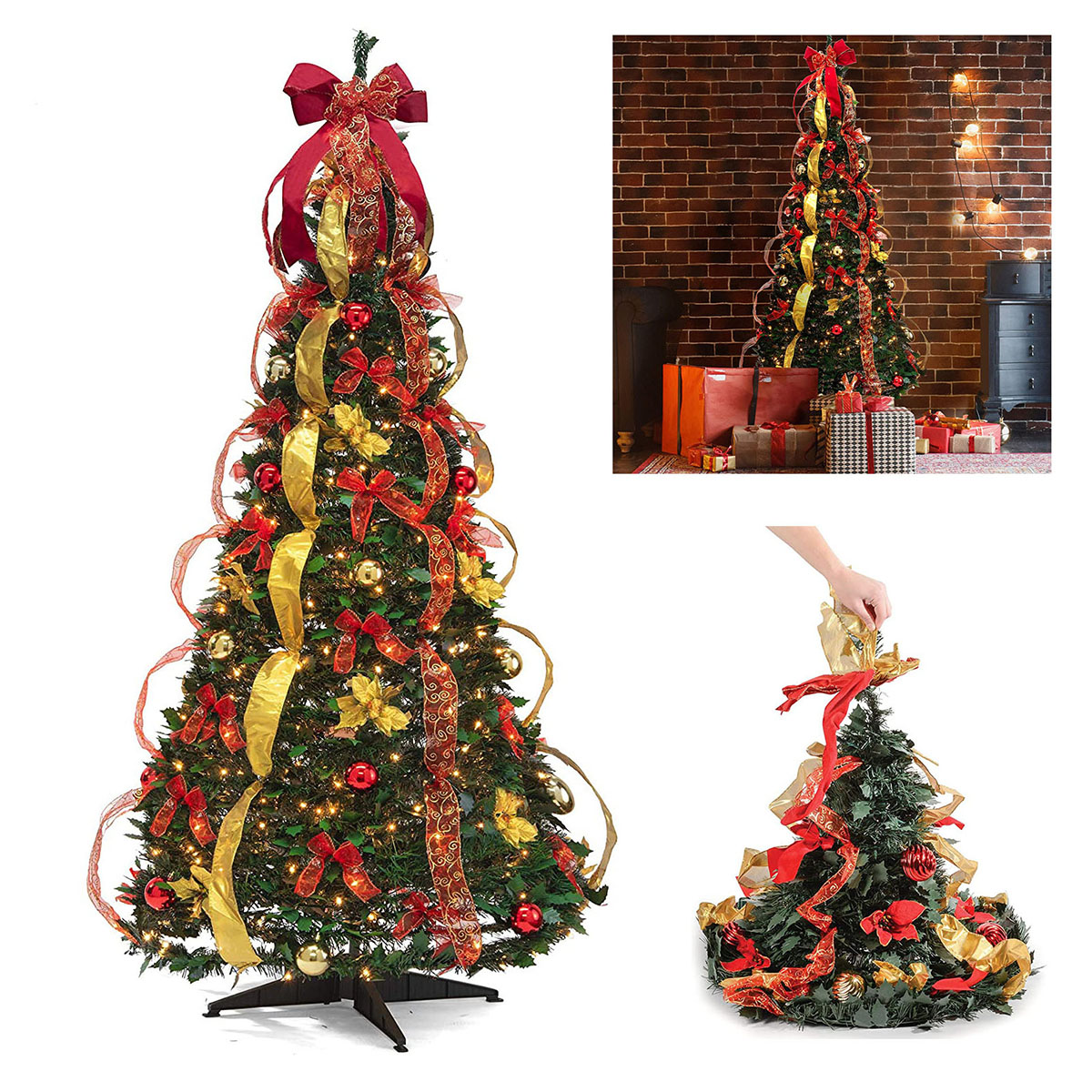The perfect size for any spaces, this pull up Christmas tree features life branches and holly leaf accents, all beautifully decked with everything in place: fairy lights, assorted ornaments, luxurious red ribbons, bows, Christmas balls and flowers. This pre lit christmas tree simply pops up from its box in seconds and is ready to transform your home, apartment, condo, office space, bedroom into a Christmas wonderland, making your holiday decorating easier than ever.