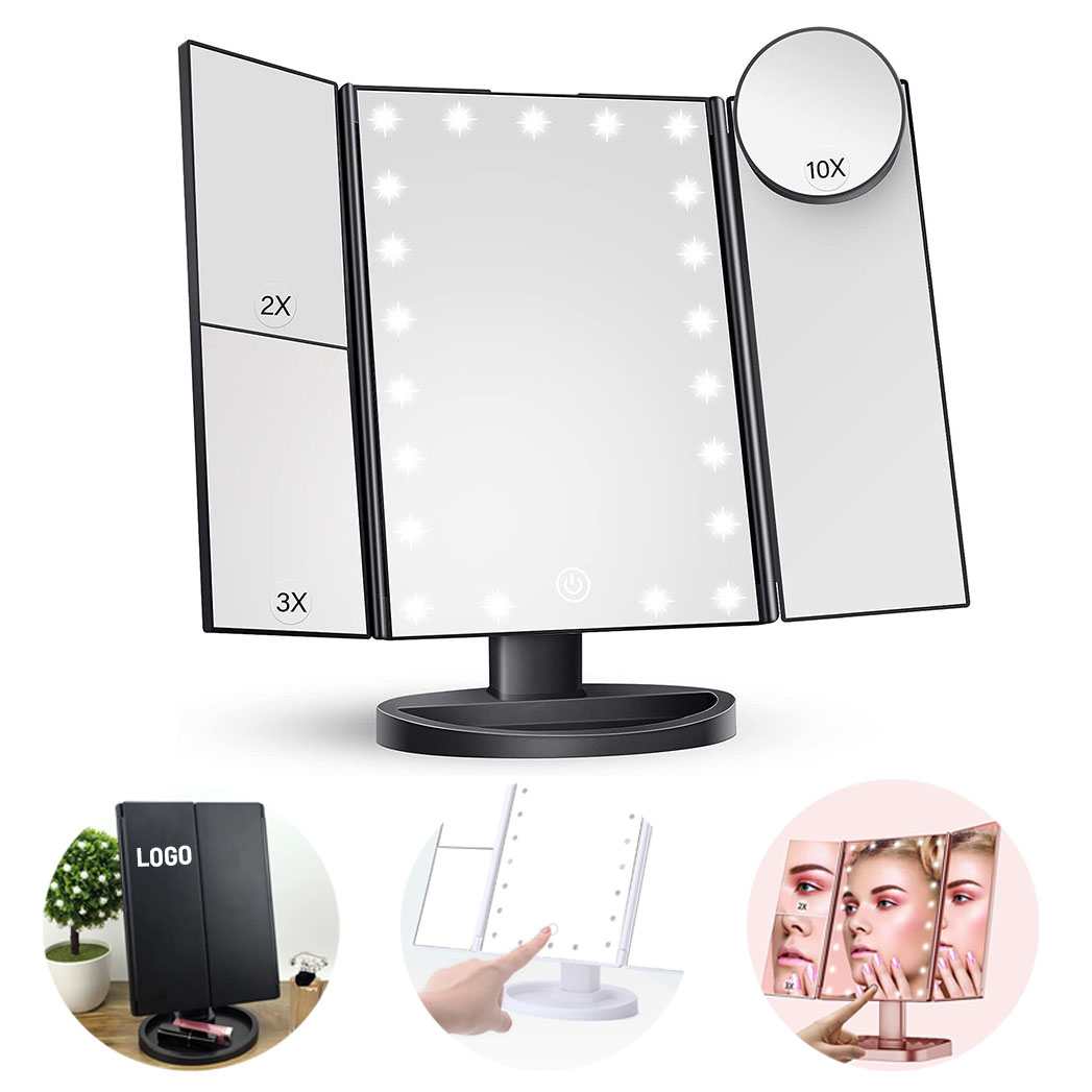 This led mirror comes with 2X and 3X magnifying mirrors, which can clearly focus on facial details to see your face clearly and create perfect makeup. The attached detachable 10X magnifying mirror is very suitable for applying eyeliner and mascara, modifying eyebrows, etc. You can fix the makeup mirror at any angle you want, and the tri-fold design is convenient to fold when not in use to prevent dust or scratches. It works with 4 AAA batteries (not included) or a USB cable, and the brightness can be adjusted intelligently through the touch-sensitive switch.