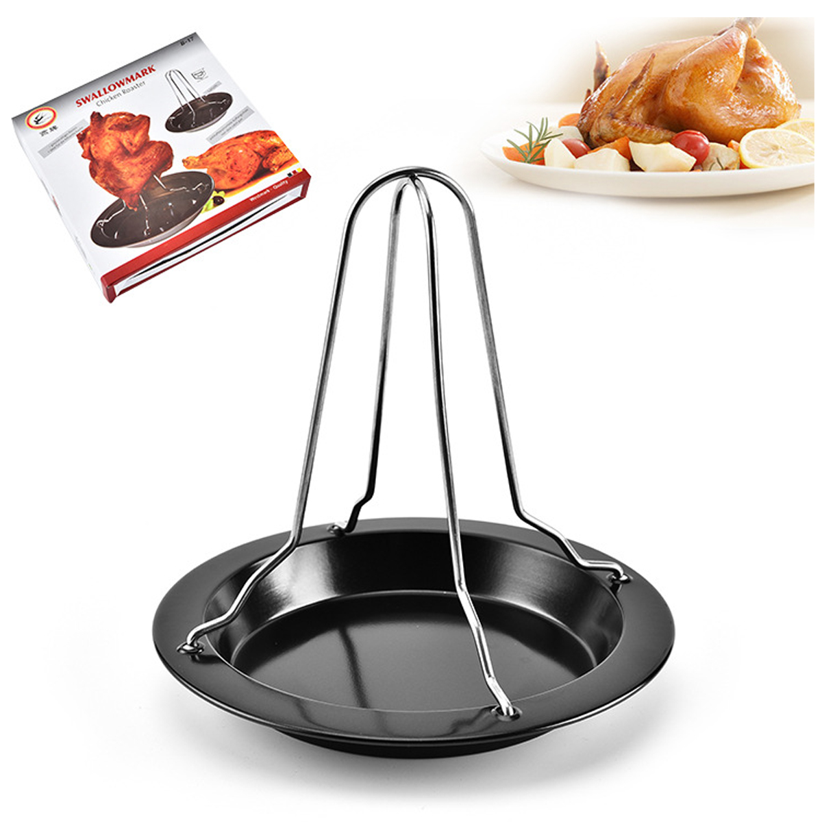Made of high quality stainless steel, safety and nonpoisonous. Easy to install and removable, portable and durable. Use for roasted and grilled chicken. The base plate is for storing the falling oil or putting into condiments or for a better taste after grilled.