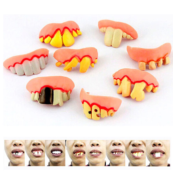 Halloween funny fake teeth, or prank denture. Made from PVC, size is around 2"x1", eight types for your choice. Wear this funny teeth on the party, make yourself to be the comedy star. Great Halloween or other party gift. For aesthetic and toy purposes only. Do NOT eat or sleep while using this product.