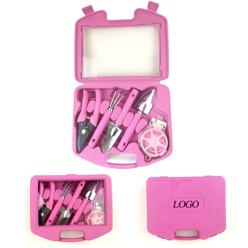 Garden Tool Kit. 5 items packed in one plastic case. Including one pruning shear(Length is 6 1/2"), two shovels(Length is 7"), one rake(Length is 6 1/2"), one bundle of binding wire(Length is 65 feet). Your LOGO can be imprinted on the outside of case.