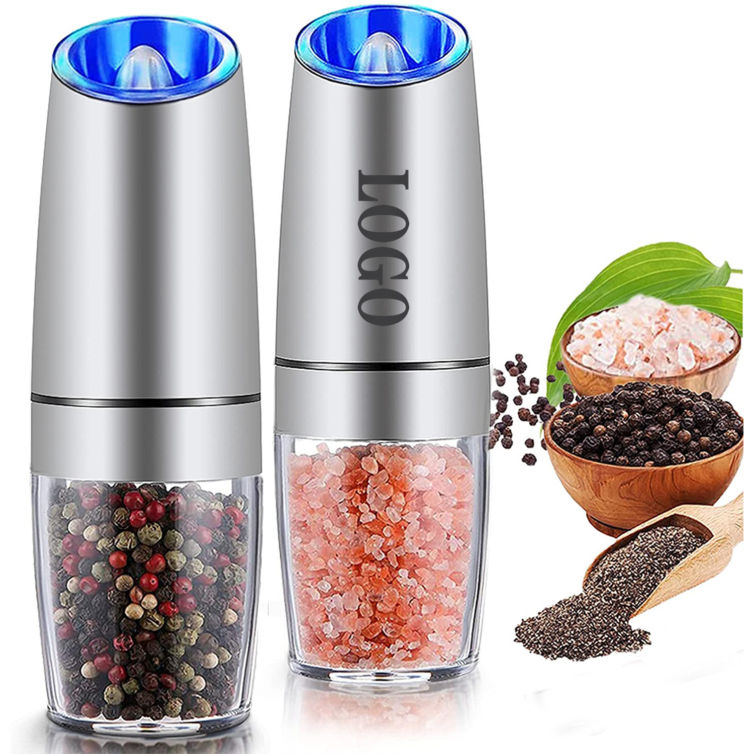 This electric salt and pepper grinder has a big and wide mouth spice container, acrylic body, adjustables ceramic blades and refillable. Just simply screws stainless steel top off the wide opening, and refill it easily with no mess. The modern and fashionable design is the perfect addition to any kitchen and also a great gift. Just simply turn upside down and get fresh ground salt or pepper. Allows you to activate the spices you like with one hand, while the other hand is free to handle other kitchen tasks. Welcome to inquiry us!