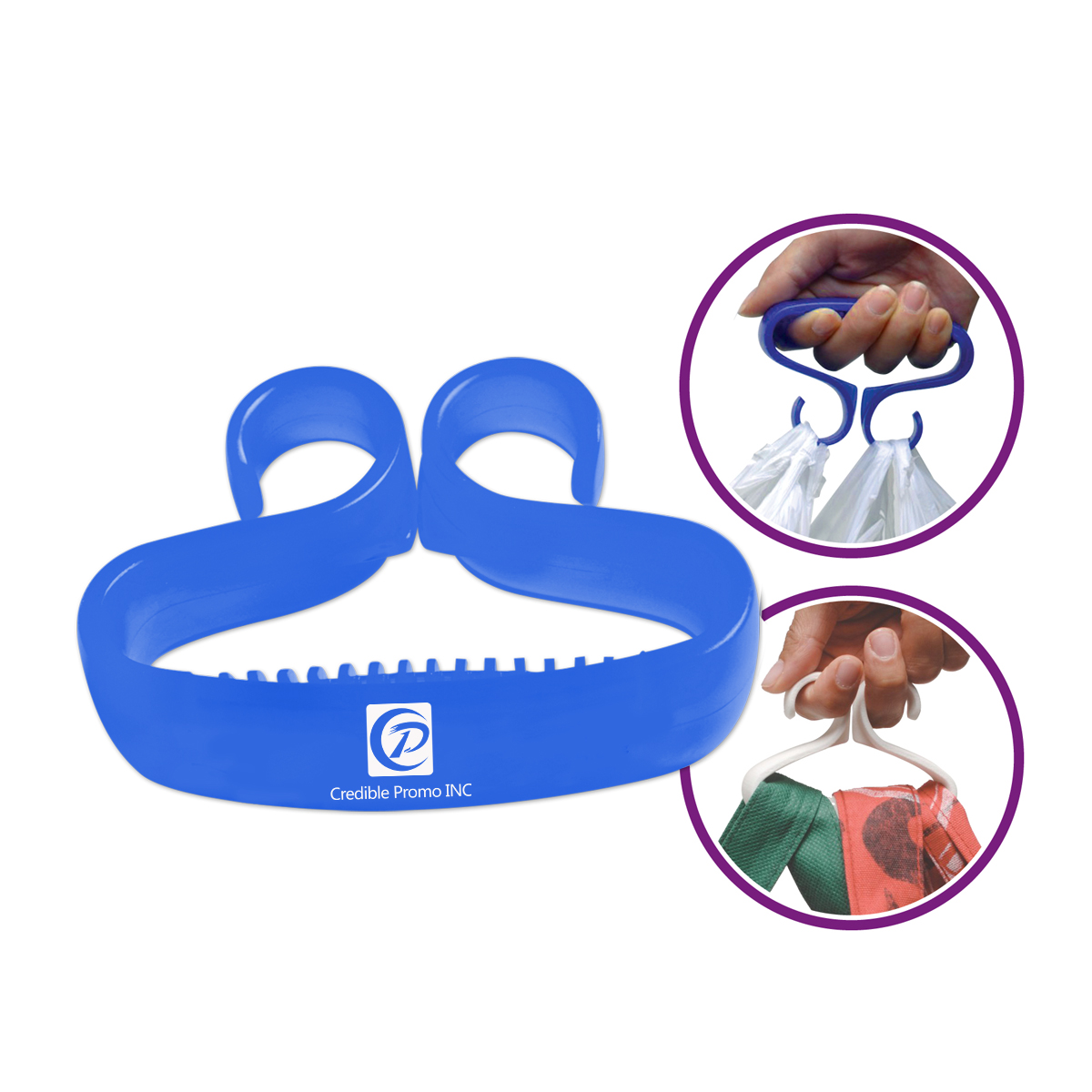 Easily carry reusable bags using grip handle or two fingers. Cuts down on germ transfers from bags. Loop groceries together to prevent spill-overs in trunk. Ideal for tradeshows, grocery stores and farmers markets.