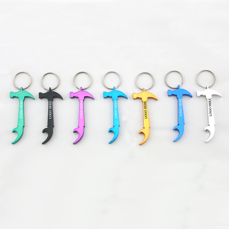 Hammer shaped bottle opener with keychain, made from aluminum alloy, length is 2.8". Many colors for your option, your LOGO can be laser engraved. We have dozens of shapes for your option. Please contact us for inquiry.