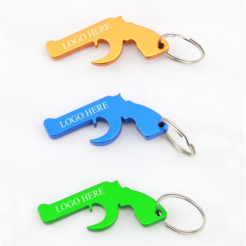 Handgun shaped bottle opener with keychain, made from aluminum alloy, length is 2.2". Many colors for your option, your LOGO can be laser engraved. We have dozens of shapes for your option. Please contact us for inquiry.