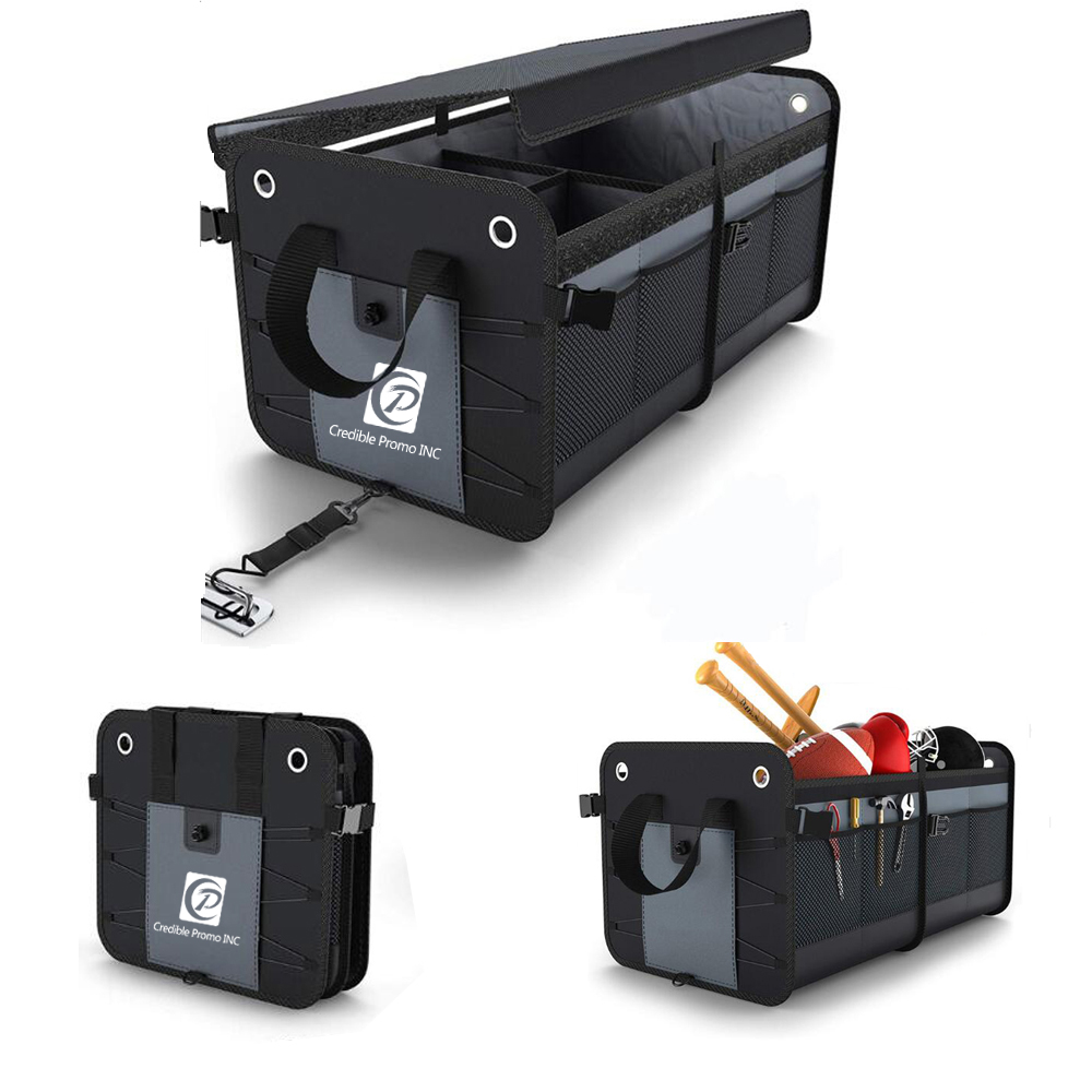 Strong and durable reinforced side walls, with non-slip bottom to keep organizer in place. Detachable cover lid is sturdy and Foldable. Securing Straps also Included.Three roomy compartments to organize important emergency equipment, tools, groceries, sporting goods, cleaning supplies, pet and kid toys, snacks, electronic accessories, and much more. Side pockets to store smaller items, such as cell phones, pill boxes, lids, keys, books, tablets, maps, magazines, etc.Simply unfold the organizer, slide in the hardened base plates, attach the divider, and fill with any items you’d like. Strong Handles make it easy to carry items with you out of the car. Your LOGO can be imprinted on it.