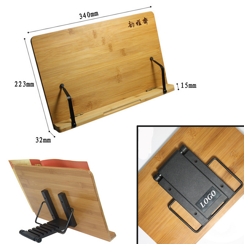 Take this high quality bamboo book holder back home right now ! Enjoy bamboo's smooth and cool feeling. Release your hands free when you are reading book. Well protect your spine. Features with adjustable holder on the backside, different reading angles available. Two movable metal clips clamp each page perfectly (with rubber protector on each tip). Your LOGO can be stamped or laser engraved on the frontside, or silk screen imprinted on the backside of holder. Three size for your option.