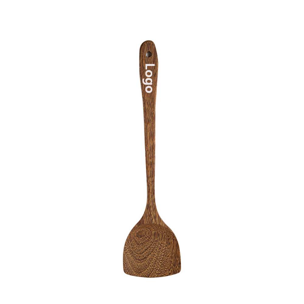 One-piece molding, naturally no splicing, stronger, not easy to break. High-quality wood, natural and healthy, safe and environmentally friendly, green and pollution-free. Selected teak wood, clear and natural wood grain, deep color, hanging hole design at the handle, convenient storage. The texture is delicate and flexible, polished smooth and round, without burrs, and does not damage the pot. Size is 38*9.5cm. Laser logo is available.