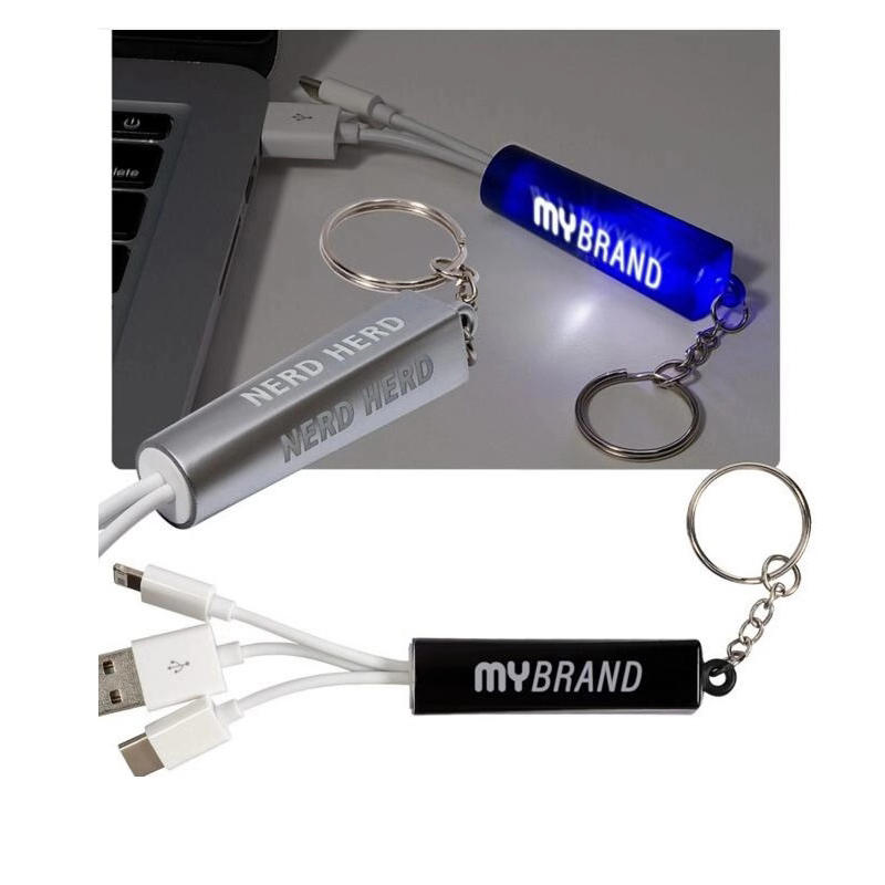 Catch this hot sale 3 in 1 charging cable now! Features with lighting up logo design, your company logo will light up with the cable is connected to computer or power bank. Including lightning 8 Pin, type C and micro USB connectors, is suitable for Apple Phones, Androids and other devices. Length is appr 5", portable and compact. With the key-chain design, this cable can decorate in your key, pocket, etc. You can charge multiple devices at once with an ample power source. Add your logo and give this out to stay by your customers' sides!