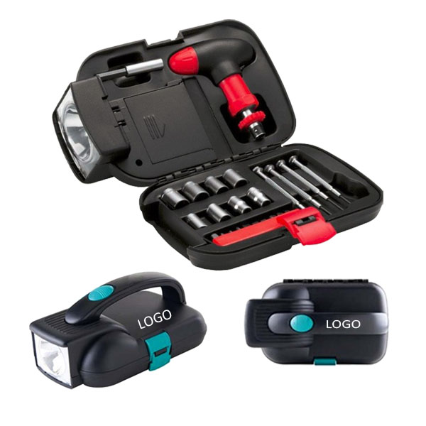 Portable and multifunctional tool set with Led flashlight, an incredibly useful and handy kit. Many models can be chosen. It includes: ratcheting T-handle, 8 sockets, 10 screwdriver bits with plastic holder, 1 magnetic bit holder, and 4 precision screwdrivers. Requires 4 AA batteries (not included). Can print your logo on the tool box.
