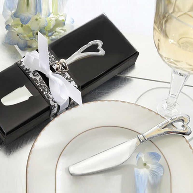 Gleaming chrome spreader with contemporary has charming heart-shaped handle. It is packed in a black gift box with clear cover and satin ribbons and suitable for wedding, party and so on.