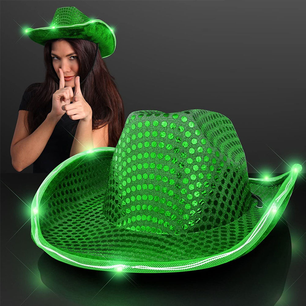 This Sequin Cowboy Hat is gonna light up the dance floor! Flashing Cowboy Hats are a hit at fairs, carnivals, country line dance night, and makes a great costume accessory. Perfect for western-themed promos, rodeos, night clubs and more! To activate your Disco Cowboy Hat, remove the pull tab & push the button on battery house up inside the hat. Choose from flash, blink & steady lighting. There are many colors of hats, we can make your logo as a woven label on the hat!