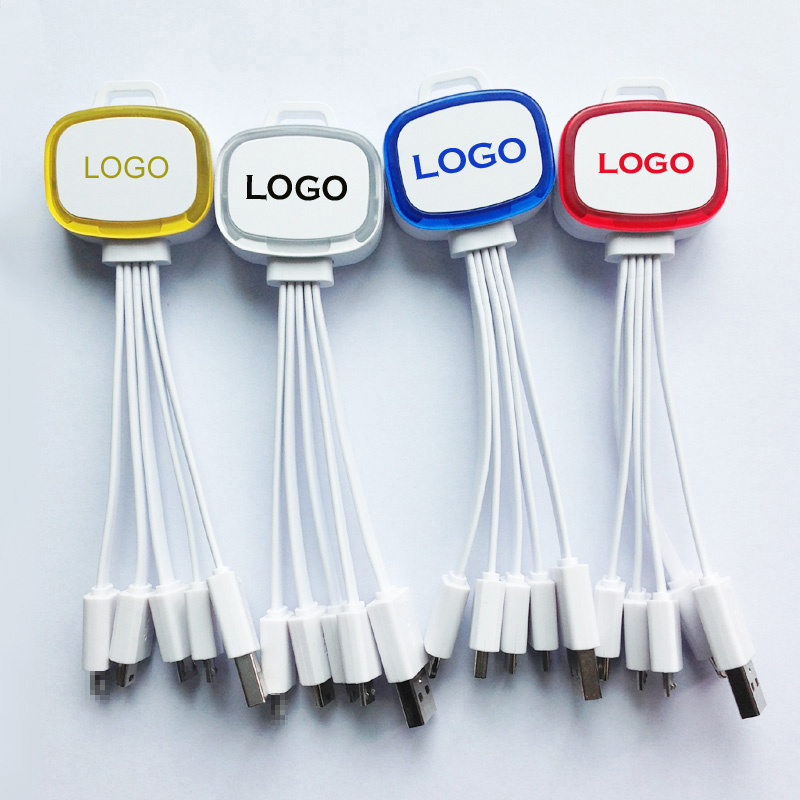New generation USB multi charging cable! Attract your clients' attention with this amazing flashing frame. Make your brand shiny on this keychain holder when charging. Suit for most of different brand phones and digital items. Such as Power bank, Apple phones, Sam Sung Phones, tablets PC, I pad, camera, etc. Including one 8PIN, two MICRO, and one MINI plug. Greatest promotional item for travel and outdoor! Put one in your car or handbag, you will never worry about forgetting charging cable. Your logo can be imprinted on the keychain holder.