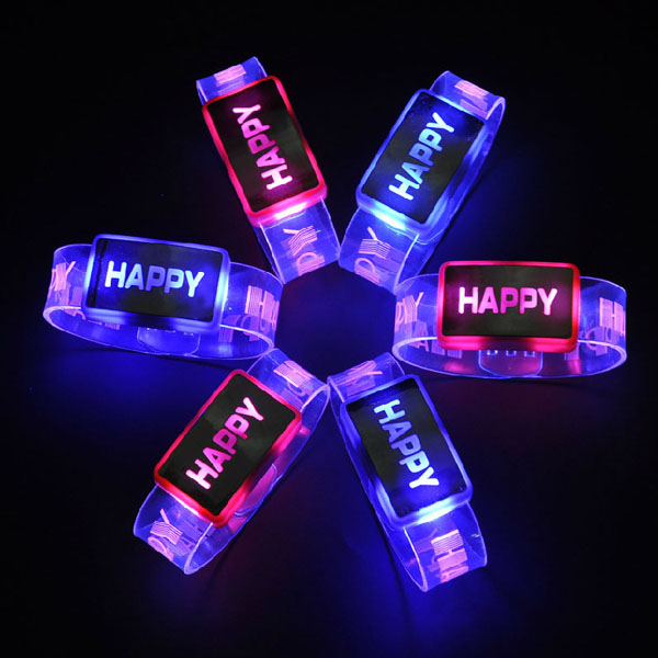 Fashion LED Slap Bracelet with switch on/off button, press the button to active flashing- steady light -off. Eco-Friendly (Nickel Free, Lead Free), With 3pcs AG3 batteries (pre-installed well and replaceable), lasting 20-30 hours. Perfect for concerts, party, night clubs, disco, bar and so on. Suitable for children and adults. Many colors and your customized LOGO is available.