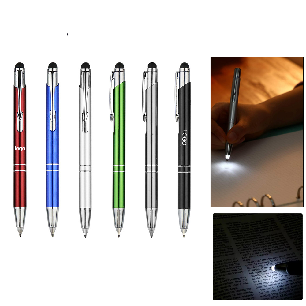 The perfect 3-in-1 pen to write in the dark! This sleek and stylish black writing utensil features a ballpoint pen, a stylus tip for touchscreen devices and LED flashlight tip with an illuminating bright white light. What an outstanding promotional giveaway for schools, banks, hotels and so much more! Customize with an imprint of your company logo and message for increased brand exposure on a dazzling gift!