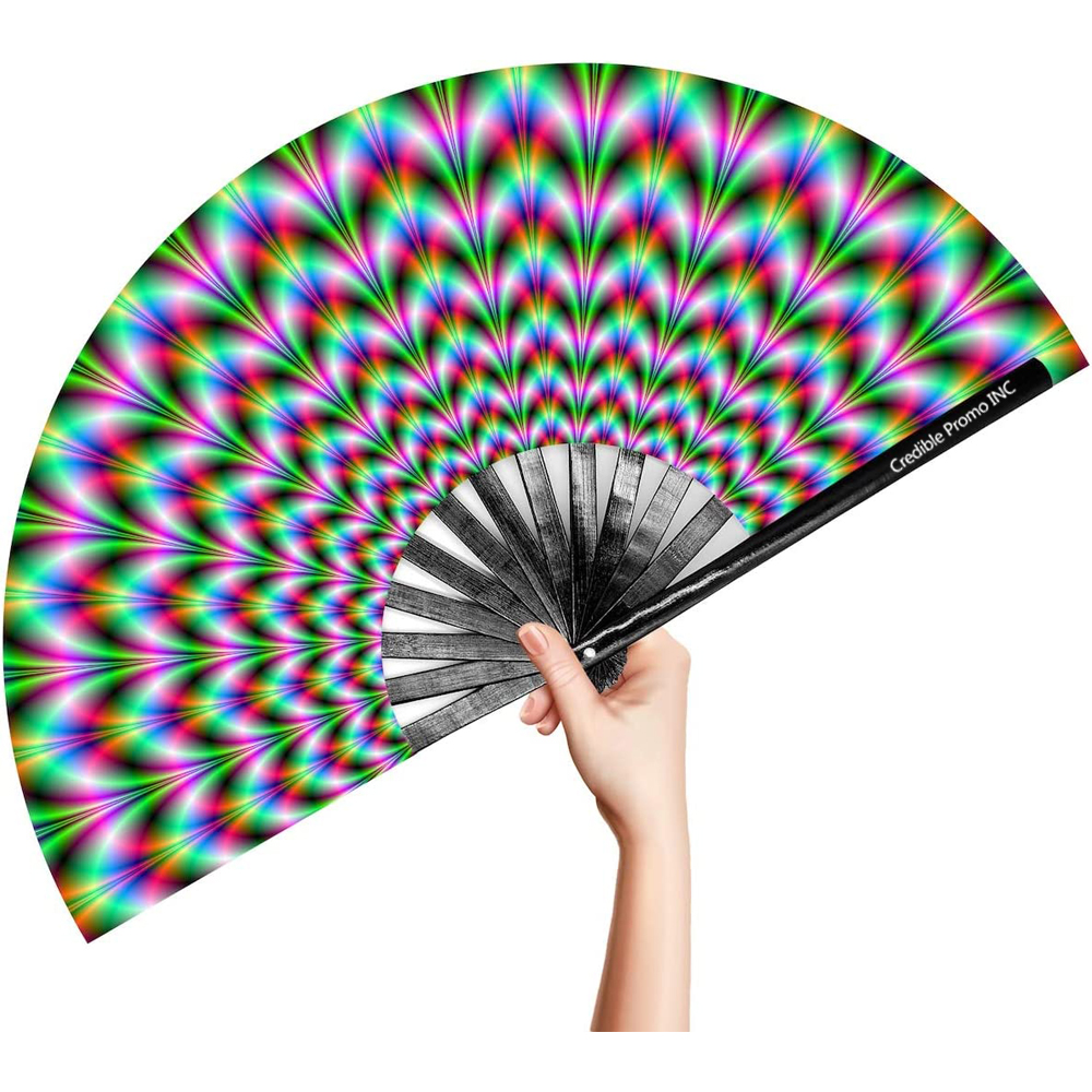 Large Hand Fan Opens with a snap of the wrist! Makes a loud clack sound when open with speed. Smooth & Easy Opening and Clothing. Our Hand Fans are your essential for your next rave or music festival.