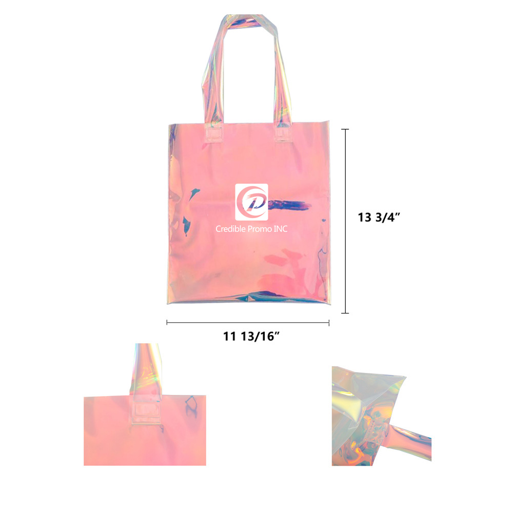 This laser bag is made of 30 silk PVC material. Used as shoulder bag or handbag. With large capacity, you can put your umbrella, make-ups, cellphone, clothes, bottles, I.D., keys and other personal belongings in it. Ideal fashion bag for shopping, travel,school,sports. Various sizes available. Price given is based on size of 13 3/4"x11 13/16". Your LOGO is welcomed on the bag.