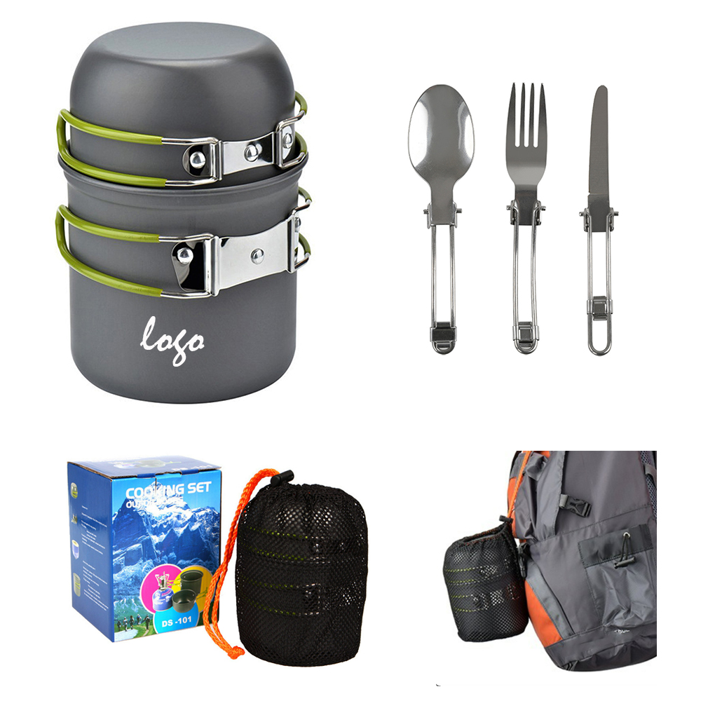 Bring the comforts of your home's kitchen out to the wilderness with this cookware mess kit! This 4.92" x 5" x 6.69" product is made of aluminum and includes a small pot, bowl, spoon, dining knife, fork, and a small carry bag. When using this kit, you won't ever have to worry about burning your hands as the anti-slip pot's handles and the silicone protector are all anti-heat. This durable product is built to last and will easily become your favorite camping essential. Cook up some enthusiasm at your next tradeshow giveaway or convention with this must-have promotion!