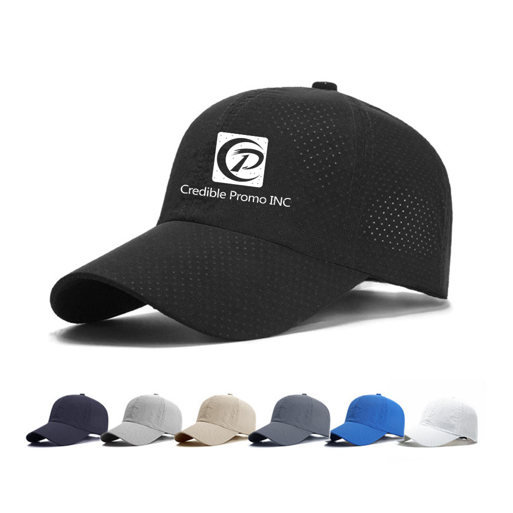 This breathable cap is made from airy performated mesh. Low crown design with a pre-curved visor. Features with perforated quick dry mesh fabric, adjustable closure at back. Ventilating perforations give superior breathability and cooling. Perfect summer hat that stays put when jogging, skating, surfing, or working out. Great for all-day wear. Welcome to inquiry us with your artwork screen imprinted!