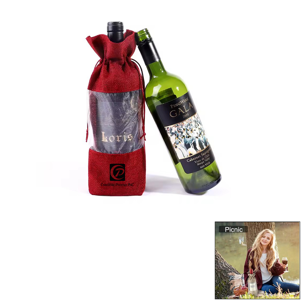 Linen Wine Bottle Gift Wrap Drawstring Bag With Clear Sheer Window