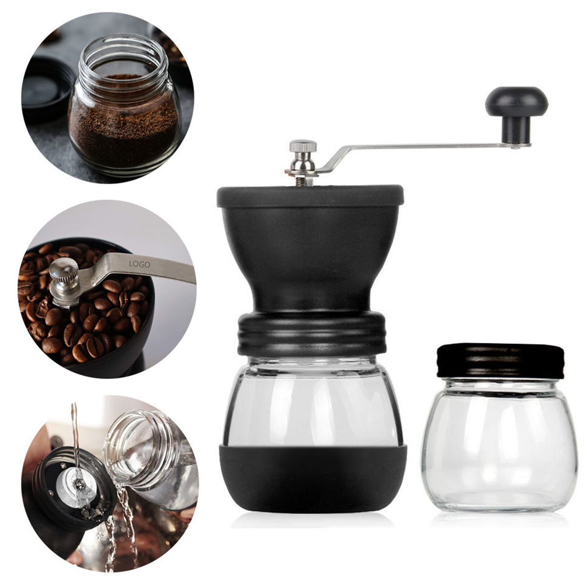 | Feature : | Manual Coffee Bean Grinder With Ceramic Conical Burr And Two Glass Jars Travel Coffee Mill For Espresso |