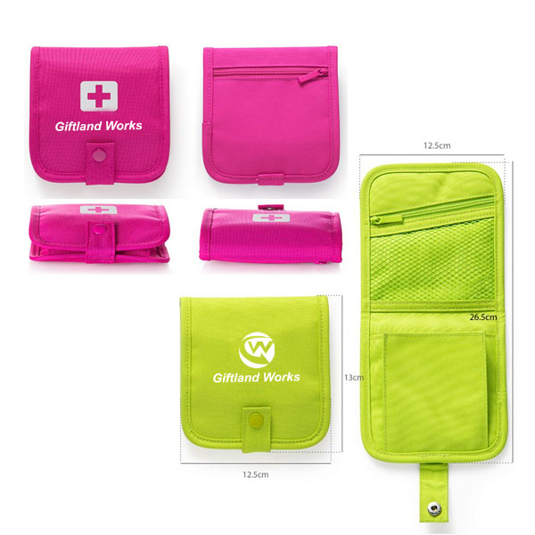 Medicine Storage Bag, with bag size 5.1" x 4.9". The bag has one mesh pocket with zipper closure, and another pocket can be used for pp box or medicine bottles. There is also a pocket with zipper outside. It is very useful and practical medicine bag for you to bring when outside. Can be printed with customer's logo on it.