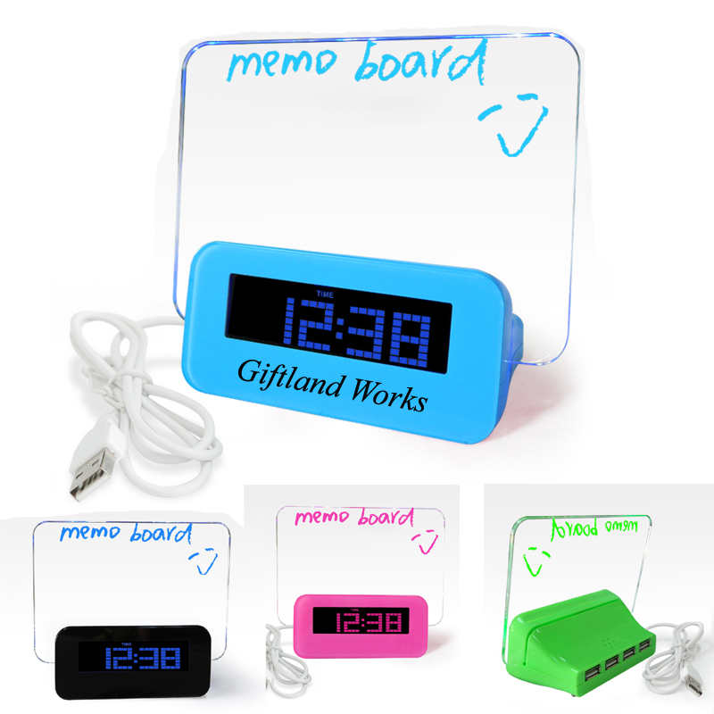 Creative message board with LED lights and USB Hub, Alarm Clock. Used for highlighting important and fun messages at your business or home. Shows your message wonderfully and colorfully. Simply by a power on/off button at the back of the board. There are 4 USB plugs on the backside as a USB Hub. Including one colored pen with eraser. Your customized LOGO can be imprinted on the bottom side.