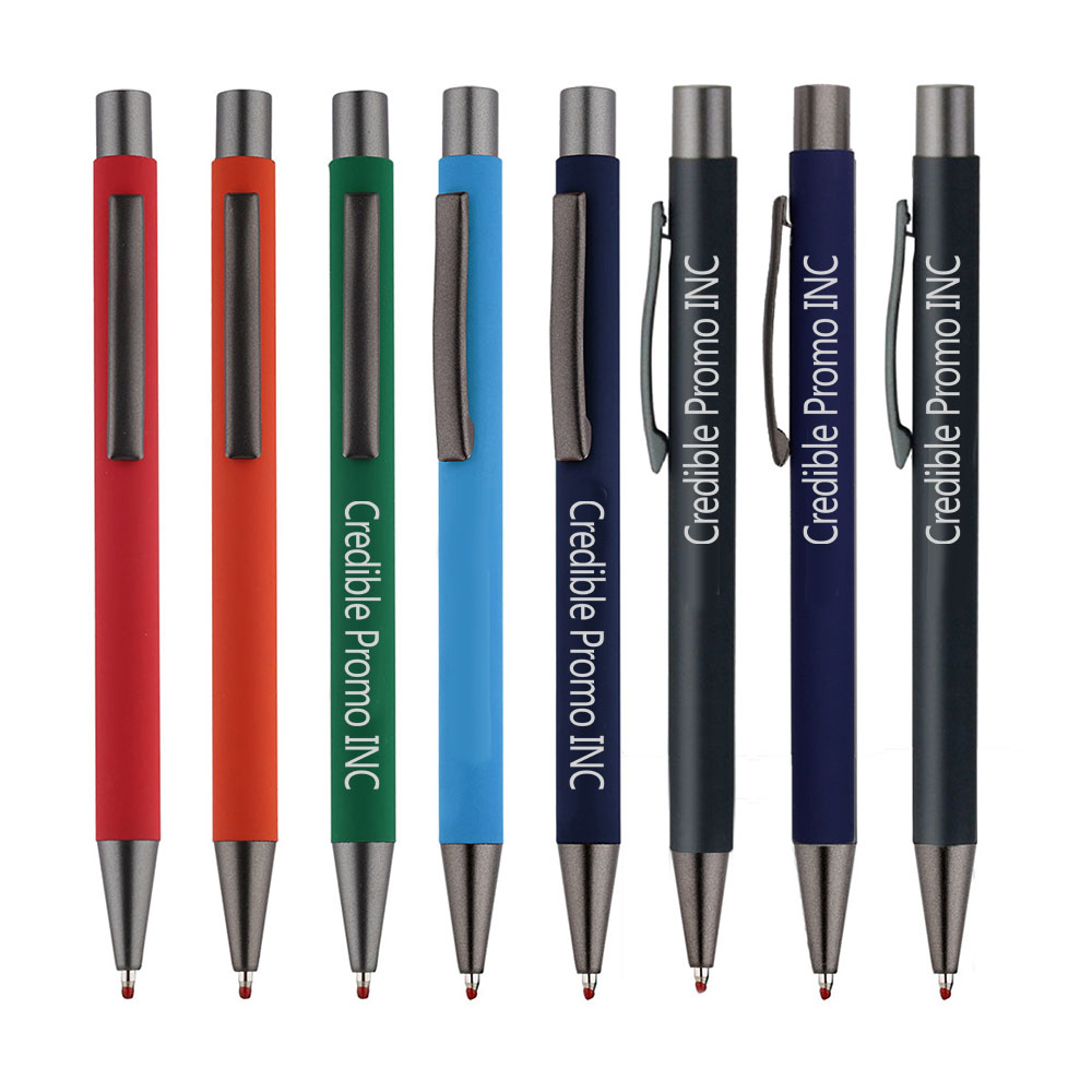 This is a click action aluminum ballpoint pen, features with rubber finish and gun metal colored accents. Your artwork can be laser engraved in matte silver color, or screen imprinted with other color. Black or blue ink is available for this ballpoint pen. Multiple item colors for your choice.