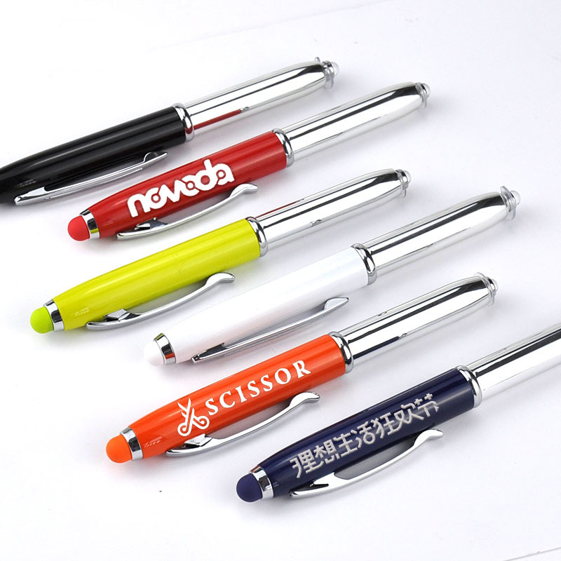 Multi-functional pen, metal shell, features a flashlight tip and a stylus cap for operating touch screen devices. Batteries included. A great pen for promote your business. Many colors for your option and custom color is available. Your customized artwork can be laser engraved or silk screened on it.