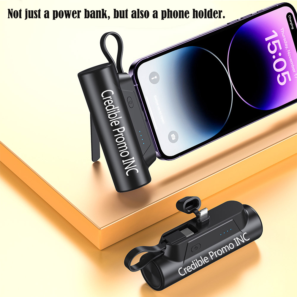 Mini pocket size design, small as a lipstick! This multi-functional power bank comes with Type-C, and 5-pin ends for charging both Android and Apple devices, features with a built-in foldable phone stand that can easily stand your iphone up horizontally/vertically. Whether it's catching up on a show or listening to music or video calls with your family is very convenient. Volume 5,000 mAh, fast charging. Multi colors for your option!