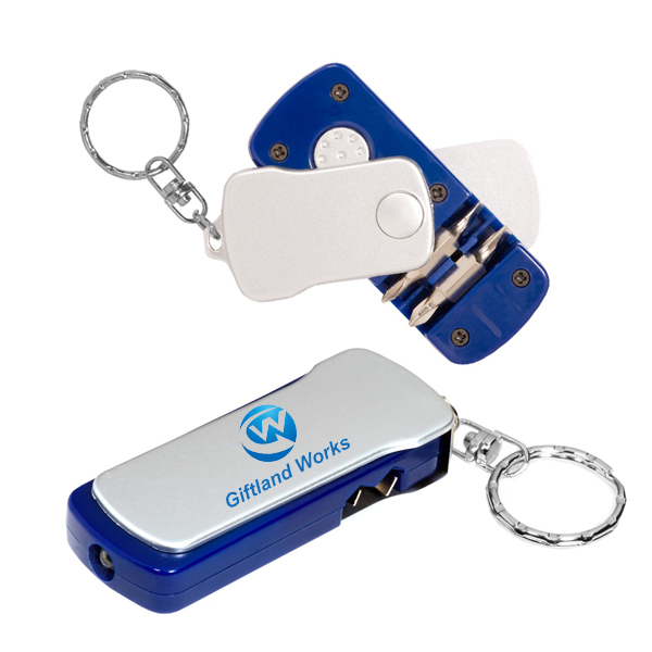This Mini Screwdriver Set With Led Light includes: Swivel tool to access key light or screwdriver, replaceable button cell batteries inserted and 2 nibs with phillips and flathead screwdriver heads and key ring.