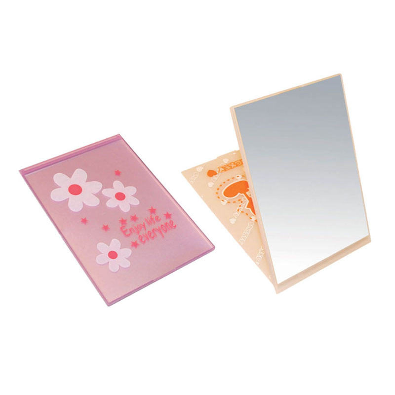 Rectangle countertop mirror. Made from plastic and glass. Size is 8 1/2"x6". Open it and stand it on the table. Ideal for daily use, house, office, salon and beauty business etc. Your LOGO can be imprinted on the outside of mirror.