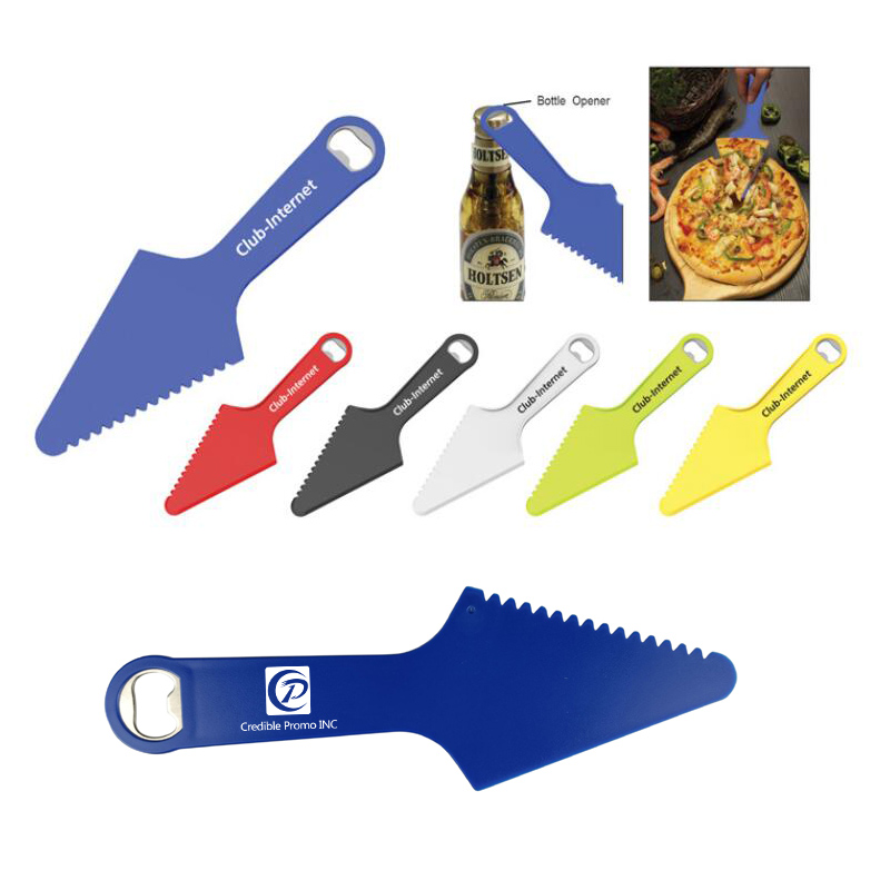 Multi functional pizza cutter, with pizza shovel and bottle opener design. Made from food safety, sturdy and durable material. Indispensable promotional item for Pizza theme activities. Three functions in one design makes it more popular. Your artwork can be imprinted on the large area.