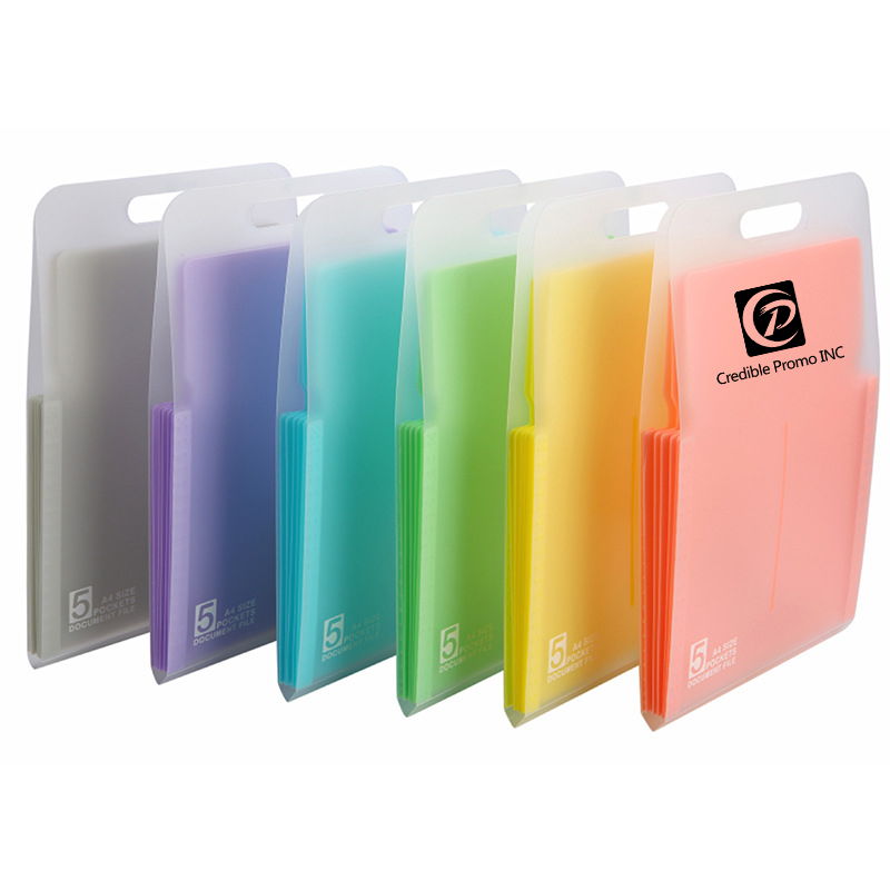 "Pocket folder is made of high quality polypropylene (PP) material. Durable and thick, can be used for a long time. With 5 pockets. Perfect document organizer to keep important documents safe and organized. Ideal for home, work, office, business, family, school, and college. Your logo can be imprinted on it.
