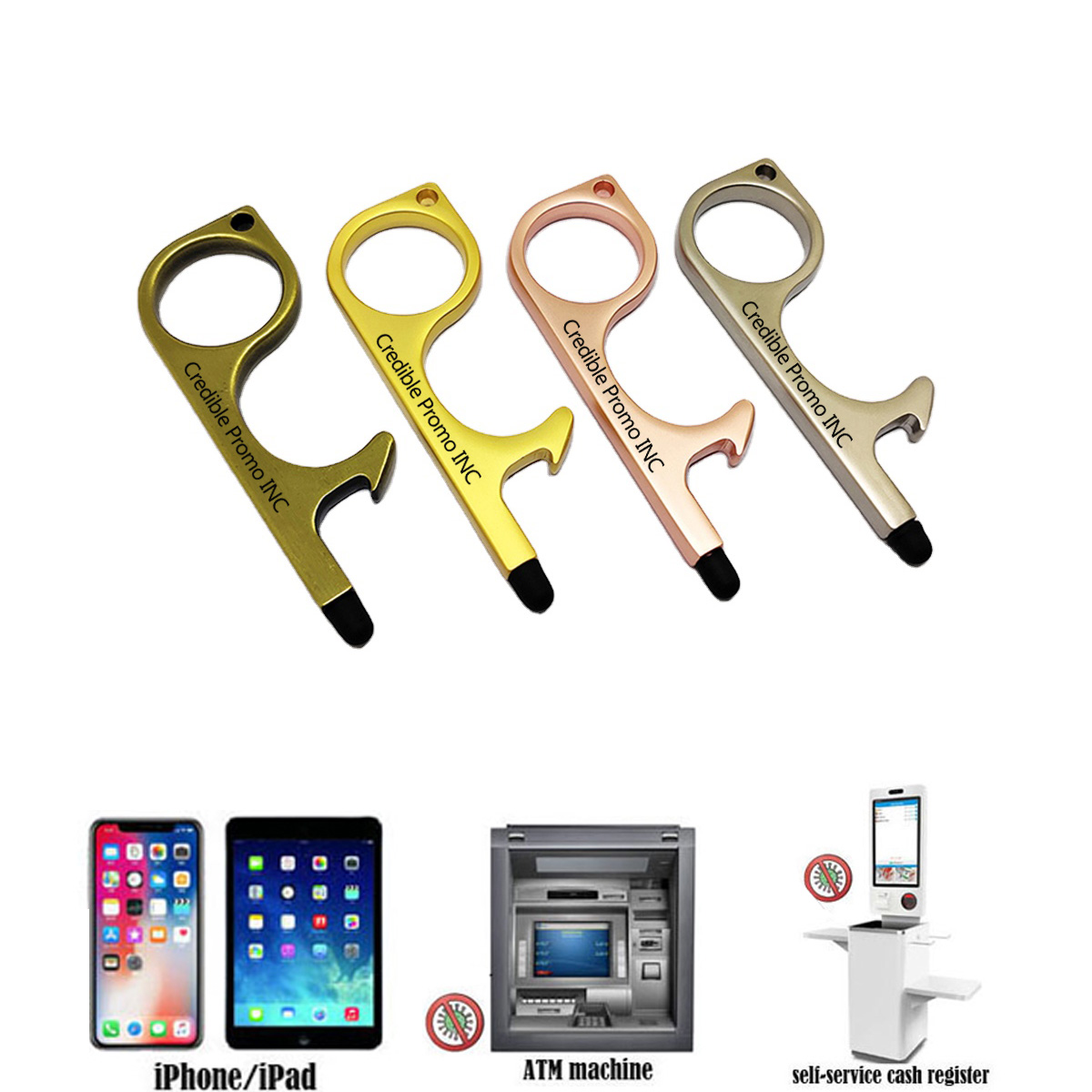 Non-contact door openers can help us avoid direct contact with public equipment, the front has a stylus point that can be used to press buttons on pin pads, elevators and light switches. Made of alloy. 76*31.5*5mm.