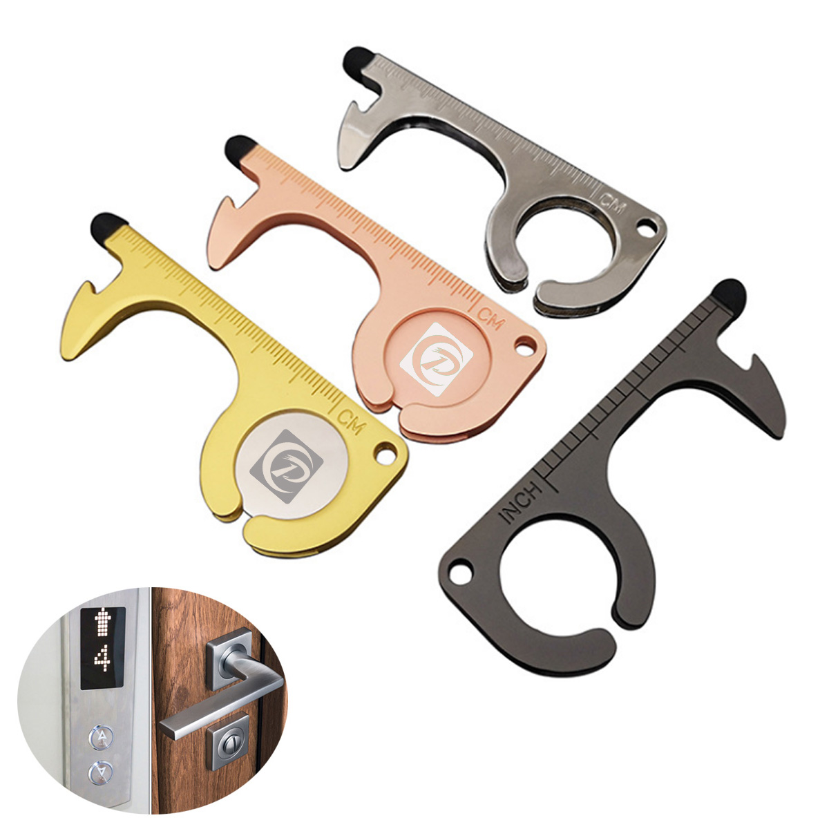 Non-contact door openers can help us avoid direct contact with public equipment, the front has a stylus point that can be used to press buttons on pin pads, elevators and light switches. With bottle opener, stylus, inch centimeter scale and other functions. Made of zinc alloy. 85*32*5mm. Key ring is available.