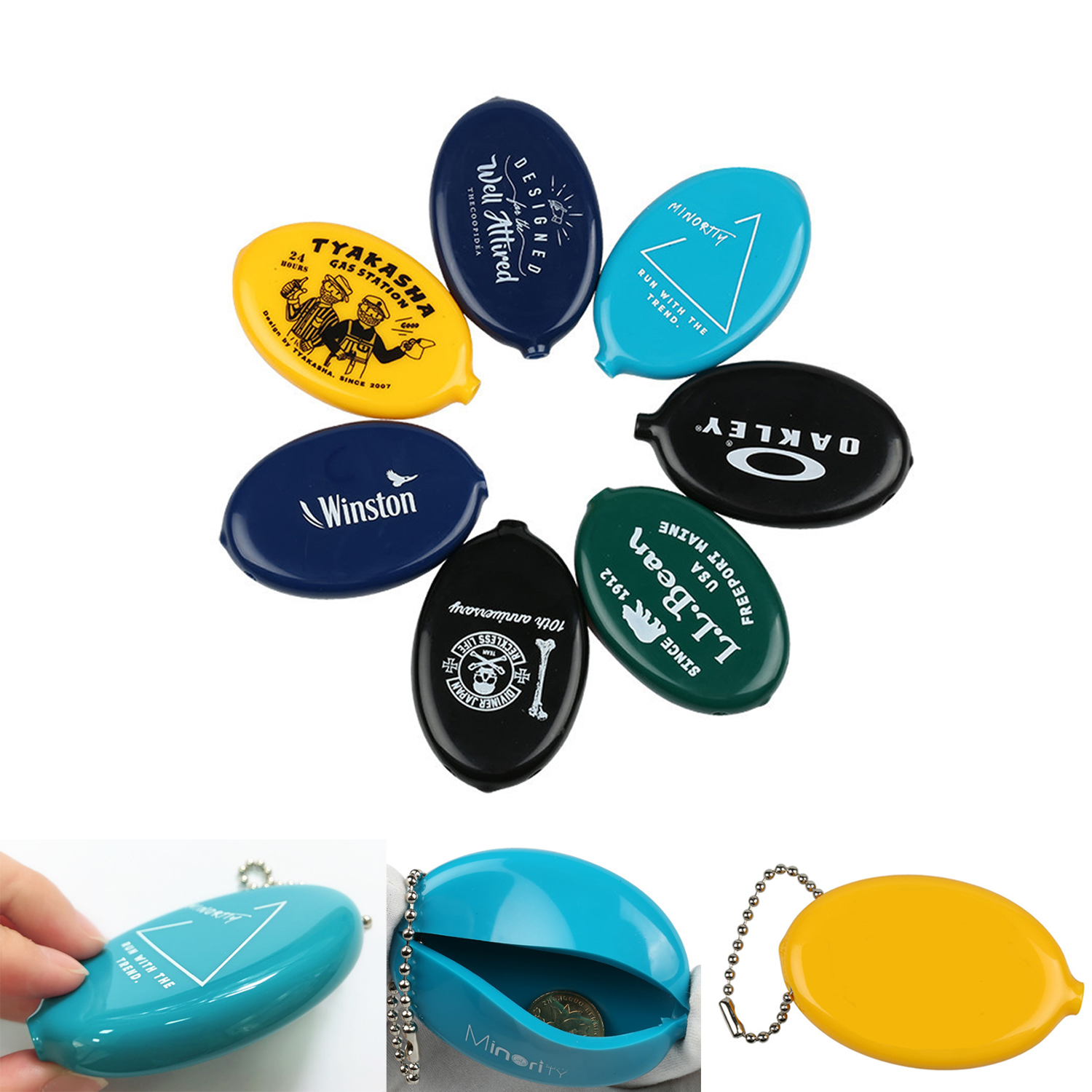 This squeeze coin purse has a beaded chain key ring to attach your keys. Easily squeeze the ends of the coin purse and insert or remove your change. Great for keeping your coins in your pocket and not falling out. Pantone and logo are available.