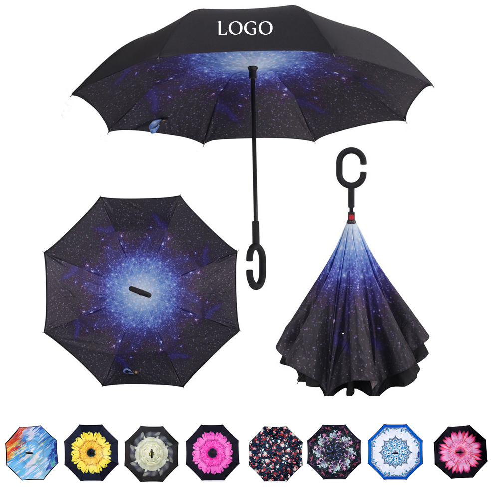 There are many patterns to choose. Logo is imprinted on the black layer usually. Made of double layer pongee umbrella cloth, 8 fiber bones and carbon fiber stick and automatic push-button open. C-type frosted handle can release one of your hands and it is convenient for you to do other important things. The inside out design is perfect for when you are trying to get into a car.