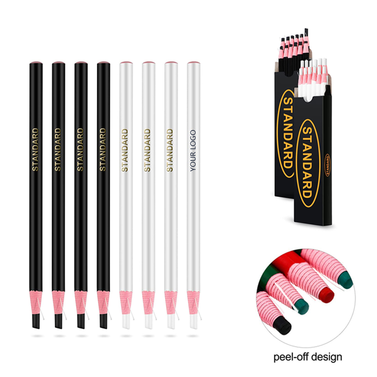 These peel-off china markers are made of quality wood and wax material, non-toxic and odorless, safe for your use, water resistant and fade-proof. Peel-off design: no need to use pencil sharpener, just pull the rope to exposes the paper wrapped core easily, no worry about breaking the refill. Useful for marking on hard, glossy non-porous surfaces, such as porcelain, glass, polished stone, plastic, ceramics and other glazed, lacquered or polished surfaces, can also be applied to porous surfaces, such as fabric, wood, and paper and most surfaces. Different colors of the china markers are provided. Add your company name or logo for more recognizable!