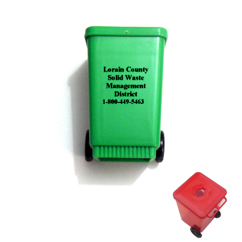 Trash Bin Shaped Pencil Sharpner, made from plastic. Size is 1.62" x 1.46" x 2.3". Great promotional item for the theme of environmental protection.