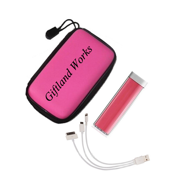 Power charger kit or power bank kit, including one lipstick shaped power bank with volume 2,000 mAh, one 3 in one cable (Can charge I5, I6, Samsung phones and so on), and EVA foam case. Case size is 5.1"x3.15"x1.57". Cute and portable. Your best partner when travel outside. Your customized LOGO can be imprinted on the EVA case or on the power charger.