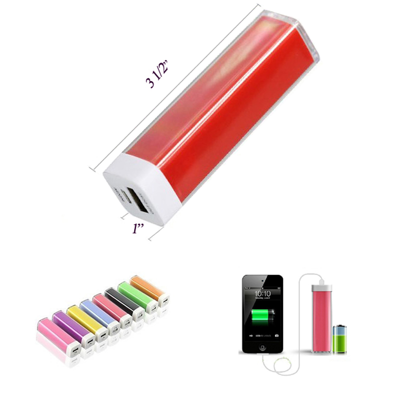 Portable power bank, size is 3 1/2"x1"x1". It's the suitable size to put it into your bags, as small as a lipstick. Great partner for your short trip. The volume is 2200 mAh.Can charge most of your portable electronic devices such as iPhone, iPod, Android smart phones, regular mobile phones, digital cameras, etc. Each full loading can charge your Iphone more than once. Recharge more than 500 times. Many colors and your customized LOGO is available.
