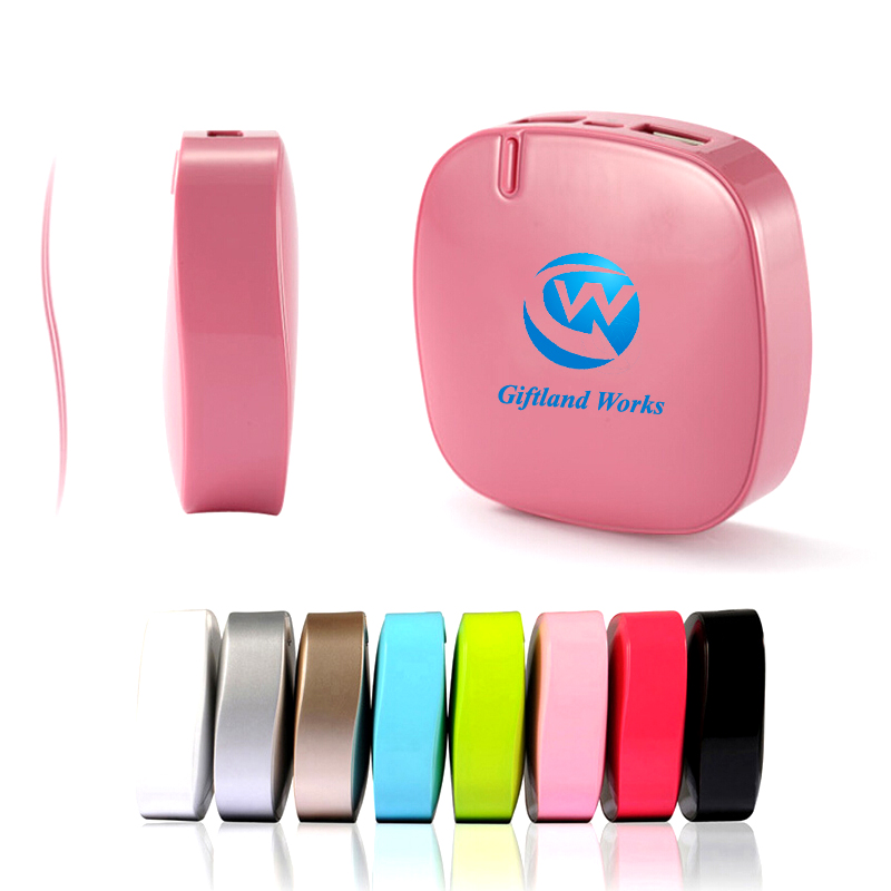 Portable power bank, moonstone shape. Size is 3 1/8"x3 1/8"x1". It's the suitable size to put it into your bags.Great partner for your trips. The volume is 5000 mAh. Can charge most of your portable electronic devices such as iPhone, iPod, Android smart phones, regular mobile phones, digital cameras, etc.Each full loading can charge your Iphone more than three times. Recharge more than 500 times. Many colors and your customized LOGO is available.